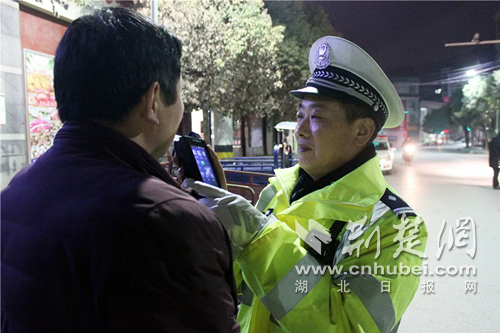 交警张华义对驾驶员进行了酒精测试。照片提供撰文:通讯员